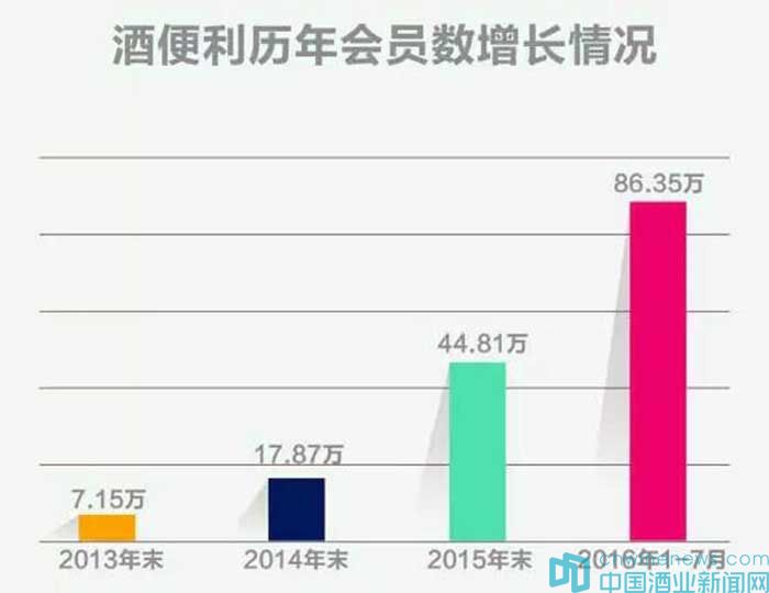 與此同時,在過去的兩年中,酒便利的會員人數也實現了快速增長。截止2016年7月底,酒便利的會員數已超過86萬人,同比增長150.56%。其中河南市場會員數達68萬人,北京市場會員數超過18萬。據了解,2013末,酒便利會員人數為7.15萬人,2014年末會員人數為17.87萬人;2015年末會員人數為44.81萬人。