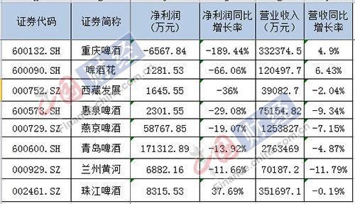 資料顯示,目前A股市場上共有8家啤酒類上市公司,2015年合計實(shí)現(xiàn)營業(yè)收入500.63億元,同比下降9.77%;合計實(shí)現(xiàn)凈利潤24.39億元,同比降幅23.98%。