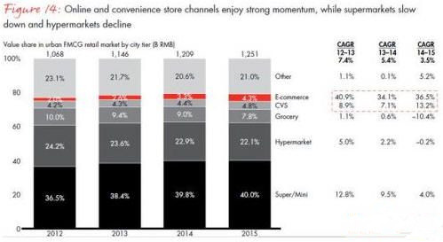 從消費渠道看,電商持續高速增長。報告稱,過去四年,中國電商市場復合年增速達到37%,產生收入近4萬億元,令中國成為全球最大電商市場。
