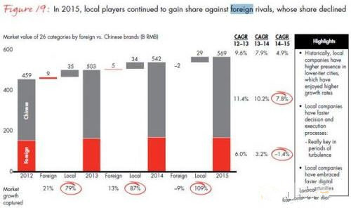 在中國本土和國外快消企業中,增速也出現兩極分化。去年,本土企業銷量同比增長近8%,而國外品牌銷量則下滑1.4%。