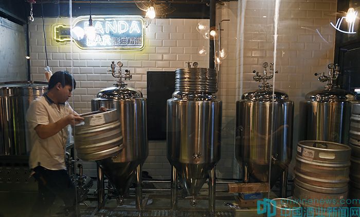 4月16日,在“熊貓精釀”長沙門店里,一位工作人員在精釀鮮啤工作間里工作。