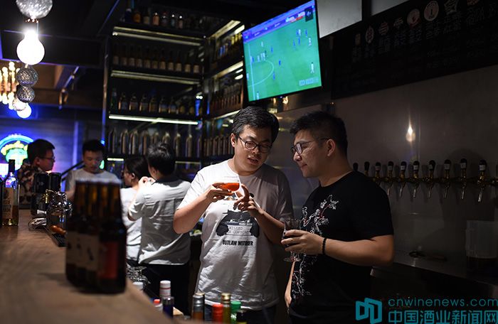4月16日,在“熊貓精釀”長沙門店里,潘丁浩(右二)和夏語林在品嘗一款新出品的鮮啤的味道。