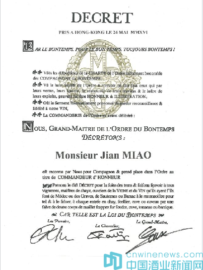 經過嚴格的篩選與評定,紅酒世界董事長苗健先生在授勛晚宴上接受了授勛。