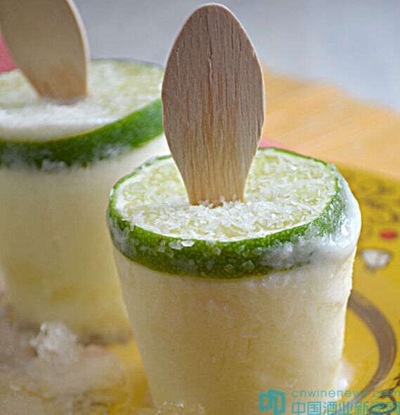 將青檸汁、煉乳、水和龍舌蘭酒混合均勻后倒入合適的冰格里,撒上少許鹽,把用小棍穿過切好的青檸切片輕輕放在液體上面,冷凍一夜。