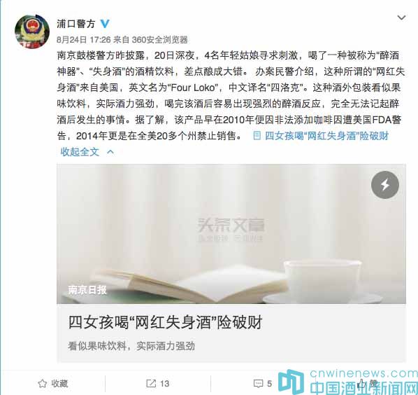 南京浦口警方通報一起與四洛克酒有關的盜竊案件