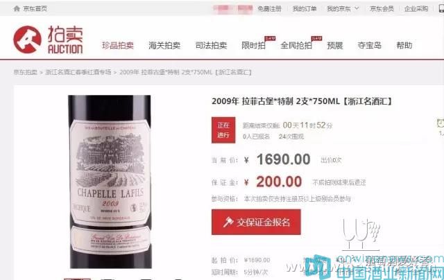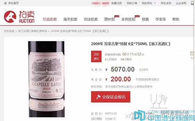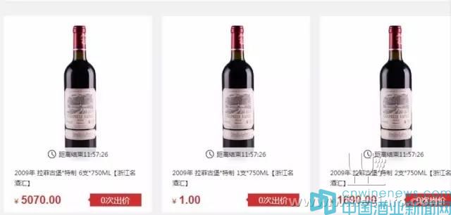 這款名為“拉菲古堡”的葡萄酒,拍品分別為750毫升6支裝,起拍價為5070元;750毫升1支裝,起拍價為1元;750毫升2支裝,起拍價為1690元。