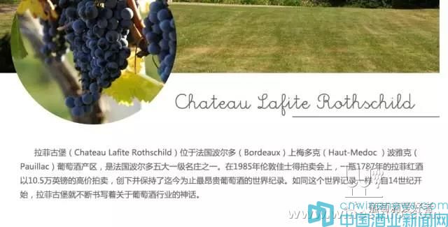 “拉菲古堡(Chateau Lafite Rothschild)位于法國波爾多(Bordeaux)上梅多克(Haut-Medoc)波雅克(Pauillac)葡萄酒產區,是法國波爾多五大一級名莊之一。在1985年倫敦佳士得拍賣會上,一瓶1787年的拉菲紅酒以10.5萬英鎊的高價拍賣,創下并保持了迄今為止最昂貴葡萄酒的世界紀錄。如同這個世界記錄一樣,自14世紀開始,拉菲古堡就不斷書寫著關于葡萄酒行業的神話。”