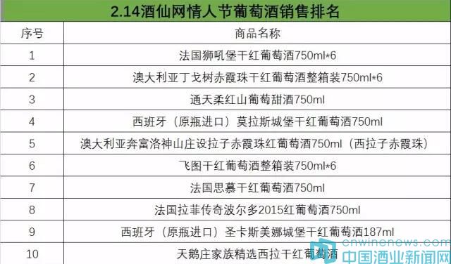 酒仙網此次特別發布了酒業第一個情人節葡萄酒銷售榜單,披露了2月14日情人節期間單日葡萄酒銷量排行榜,由于情人節往往以年輕人慶祝為主,本次榜單對于業界研究年輕消費者消費習慣和西方節日對于酒類消費的影響具有重要意義。