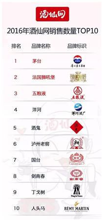 在酒仙網公布的品牌銷量TOP10總榜中,共有7款白酒、2款葡萄酒、1款洋酒上榜,其中前5名中,4款均為白酒,且由53°茅臺飛天500ml占據排名第一的位置,顯示了白酒依然在消費者的餐桌上占據主流,葡萄酒也已經成為不可或缺的組成部分,而原本以夜場消費為主的洋酒則開始引起消費者的關注。