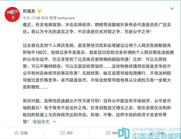 3月7日,京東集團(tuán)首席執(zhí)行官劉強(qiáng)東發(fā)布微博稱(chēng),今天的虛實(shí)之爭(zhēng),不應(yīng)該是優(yōu)劣對(duì)錯(cuò)之爭(zhēng),而應(yīng)該是公平之爭(zhēng)。他特別提到了部分網(wǎng)店享受的免稅待遇,“相當(dāng)多所謂的個(gè)人網(wǎng)店都是成規(guī)模的公司化運(yùn)作,而且享受到了比實(shí)體店更特殊的超級(jí)待遇,比如:可以無(wú)照經(jīng)營(yíng)、可以不繳納稅收、可以無(wú)固定經(jīng)營(yíng)場(chǎng)所……劣幣驅(qū)逐良幣。”