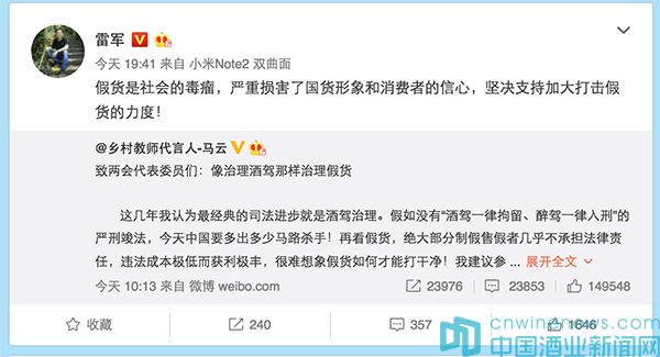 當(dāng)天早些時(shí)候,阿里巴巴董事局主席馬云馬云發(fā)微博稱(chēng),建議像治理酒駕一樣治理假貨,賣(mài)一件拘留七天,造一件入刑。他說(shuō),中國(guó)絕大部分制假售假者幾乎不承擔(dān)法律責(zé)任,違法成本極低而獲利極豐,很難想象假貨如何才能打干凈。