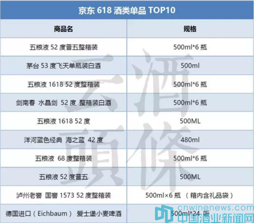 從產品維度看,京東618酒類單品TOP10分別是:五糧液52度普五整箱裝、茅臺飛天53度單瓶裝、五糧液1618 52度整箱裝、劍南春水晶劍52度整箱裝白酒、五糧液1618 52度單瓶裝、洋河藍色經典海之藍42度480ml、五糧液68度整箱裝、五糧液52度普五單瓶裝、瀘州老窖國窖1573 52度整箱裝、德國進口(Eichbaum)愛士堡小麥啤酒24聽整箱裝。