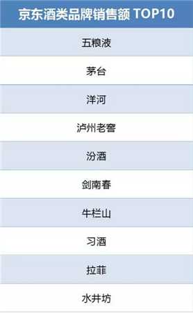 6月18日京東酒類品牌銷售額TOP10分別是:五糧液、茅臺、洋河、瀘州老窖、汾酒、劍南春、牛欄山、習酒、拉菲、水井坊。