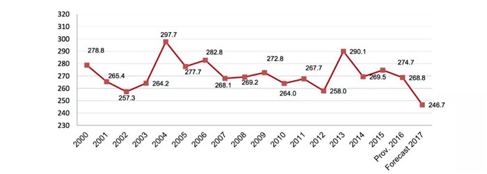 2000-2017全球產量數據圖(單位:億升)
