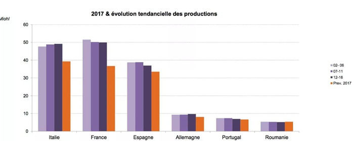 南美則收成不錯,相比2016這個低產年有不小提升。尤其是阿根廷和巴西。其中巴西產量預計為3.4億升(2016年巴西的產量為1.3億升,比2015年下降了53%)。而阿根廷則預計提高將近25%,約為11.8億升。