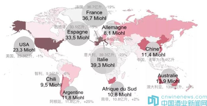 在意大利、法國和西班牙——常年盤踞全球前三的產量大國,大部分產區都因受到極端天氣影響而至產量不同程度下滑。其中法國葡萄酒產量預計下降19%至36.7億升,成為自1945年來的最低值。