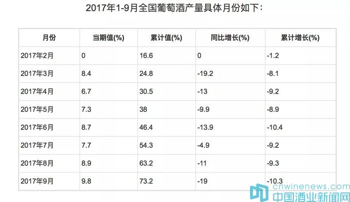 中國作為近幾年不能被忽視的葡萄酒產國,2016年產量為11.4億升。今年的具體預測數據OIV表示截止統計之日還未能確定,但根據國家統計局公布的數據,今年頭九個月的葡萄酒產量數值與去年同期相比,均為下降,如下圖。