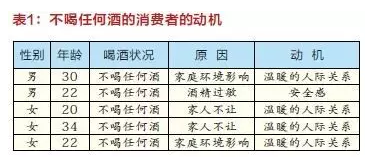 我們看到不喝任何酒的消費者男女都有,且年齡都集中在20到34之間,他們不喝任何酒的動機絕大部分是因為需要維持或者享受和諧的人際關系,這個比例為80%,另外20%則是對身體等安全感的需求,我們從表1看到的,就是這樣的結果。