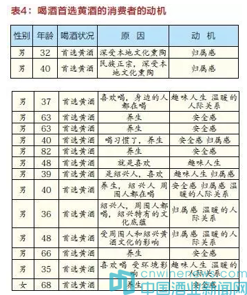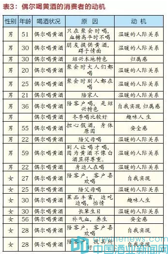 在表3中我們可以看出,偶爾喝黃酒的男士要比女多一些。這些人中,出于五種動機而消費黃酒:溫暖的人際關系、自我實現、趣味人生、歸屬感、安全感,比例分別是10:4:2:2:1,這表明偶爾喝黃酒多數是被迫的,因為無論哪個年齡段的消費者都希望借黃酒維持或不破壞聊天或吃飯氛圍,從而保持和諧的人際關系,抑或為了借飯局來使自己更成功,而非自我喜愛,主動去喝。