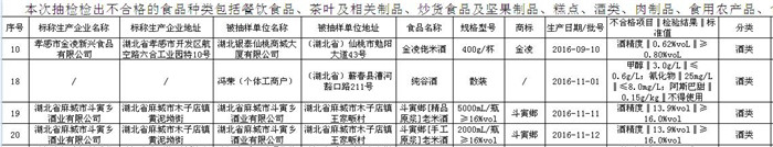 本次監(jiān)督抽檢的食品包括茶葉及相關(guān)制品、糧食加工品、其他食品、肉制品、食品添加劑、食糖、蔬菜制品、水果制品、速凍食品、糖果制品、調(diào)味品、飲料、餐飲食品、炒貨食品及堅(jiān)果制品、糕點(diǎn)、酒類、食用農(nóng)產(chǎn)品、食用油、油脂及其制品、保健食品19大類1231批次,抽樣檢驗(yàn)項(xiàng)目合格樣品1197批次,不合格樣品34批次。其中酒類不合格4批次。