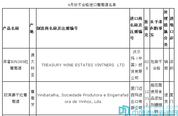 值得注意的是,進境不合格葡萄酒中,1批次由沃爾瑪(中國)投資有限公司進口的來自澳大利亞的奔富BIN389紅葡萄酒,因包裝不合格被銷毀。