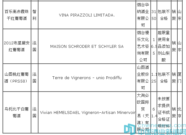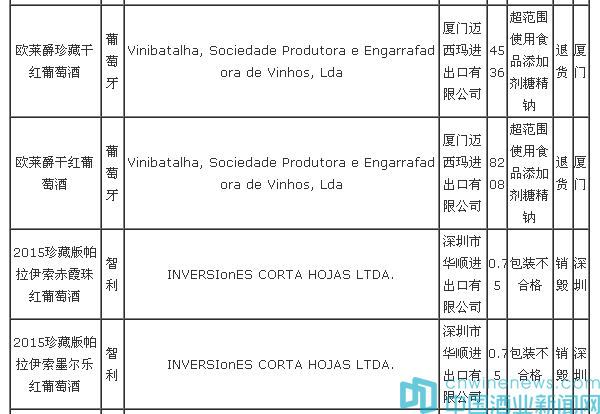 不合格產品中紅葡萄酒有12批次,其中3批次干紅葡萄酒,均來自葡萄牙進口商為廈門邁西瑪進出口有限公司,不合格原因為超范圍使用食品添加劑糖精鈉,在廈門口岸被退貨。