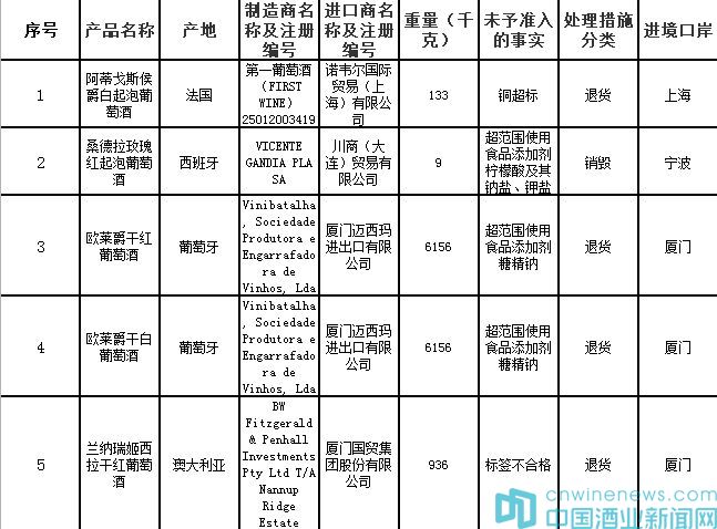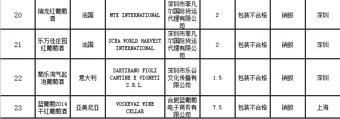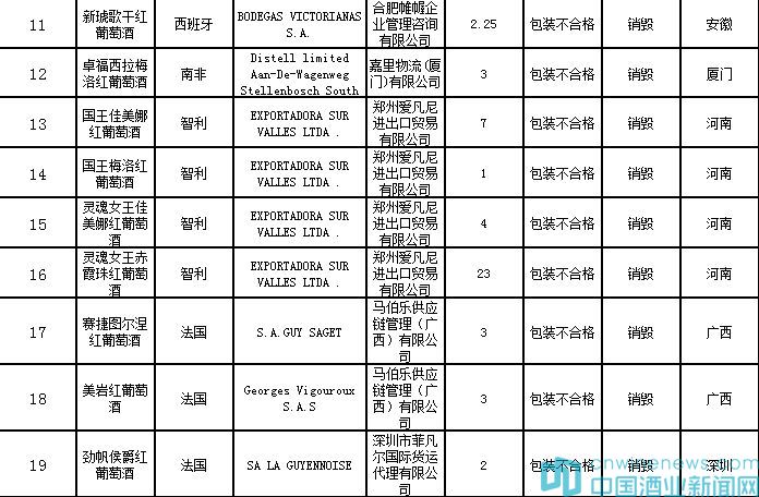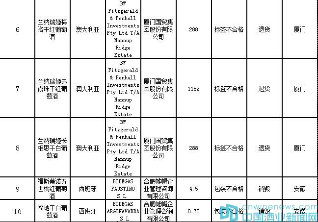 值得注意的是,不合格進(jìn)口葡萄酒中,包裝不合格占65%,有15批次,均被銷毀。另外,還有4批次來(lái)自澳大利亞的,進(jìn)口商為廈門國(guó)貿(mào)集團(tuán)股份有限公司,生產(chǎn)商為BW Fitzgerald & Penhall Investments Pty Ltd T/A Nannup Ridge Estate的葡萄酒因標(biāo)簽不合格,在廈門口岸被退貨。