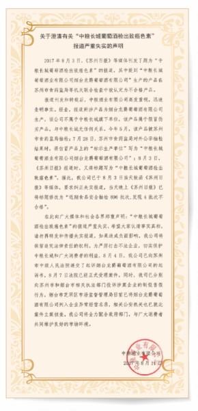 8月3日,多家媒體刊發(fā)了題為“中糧長城葡萄酒檢出致癌色素”的報(bào)道,其中提到“中糧長城葡萄酒業(yè)有限公司煙臺龍爵葡萄酒有限公司”生產(chǎn)的產(chǎn)品在蘇州市食藥監(jiān)局等機(jī)關(guān)聯(lián)合檢查中被認(rèn)定為不合格產(chǎn)品。