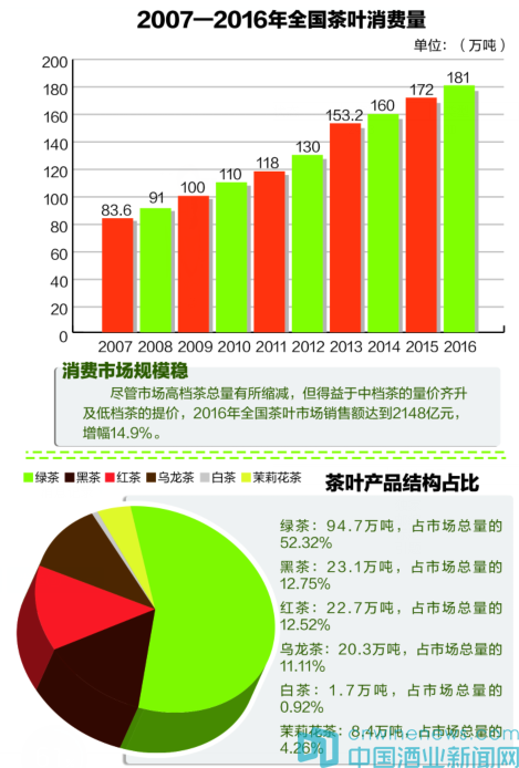 2016年,我國茶葉年消費量達到181萬噸,年增長9萬噸,增長率達到5.2%;茶葉市場銷售額達到2148億元,增幅14.9%。預計2017年全年,我國茶葉市場消費量將達到187萬噸,消費額2280億元。