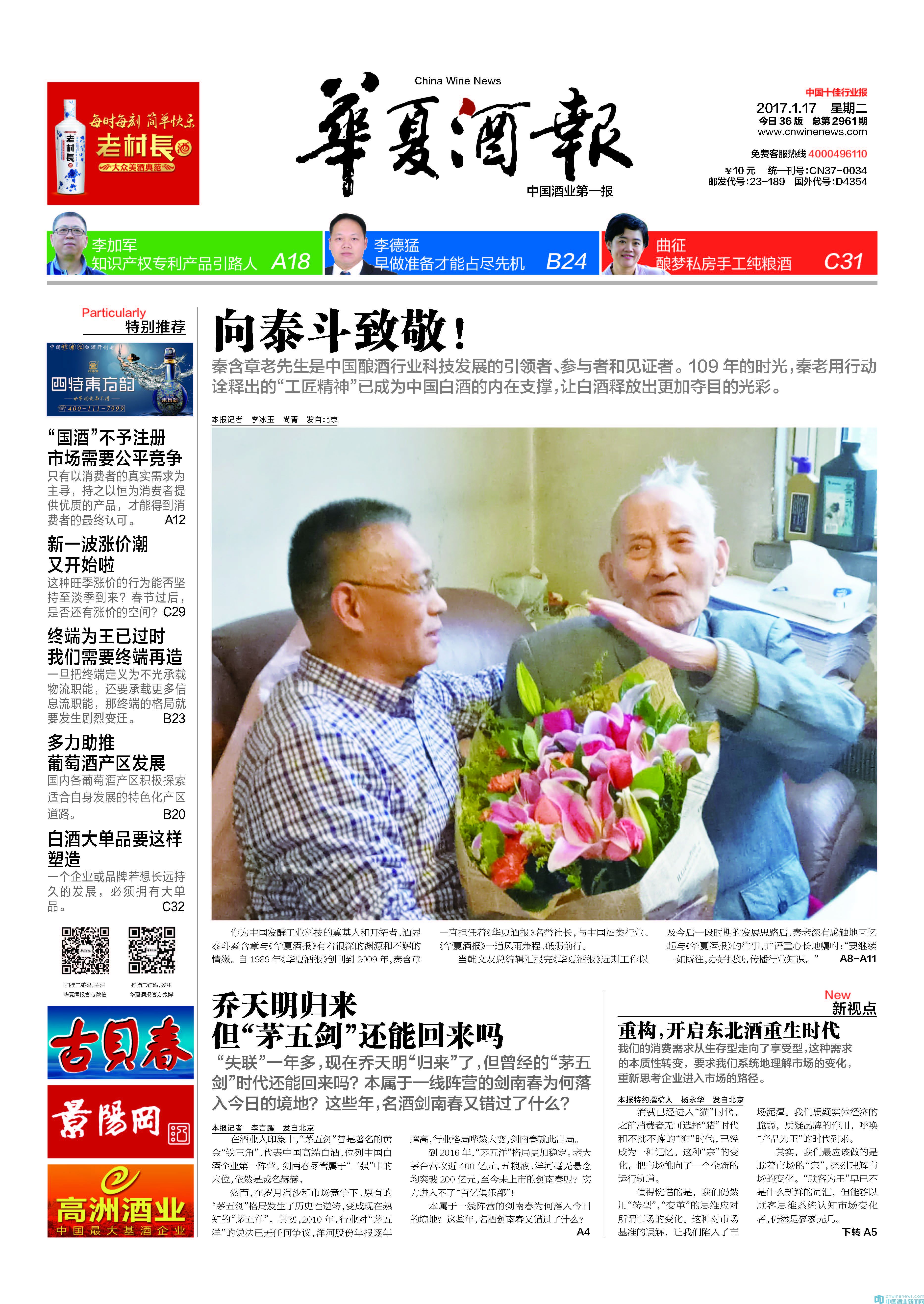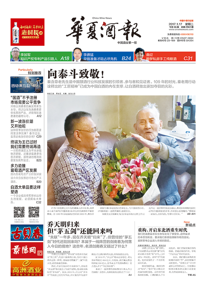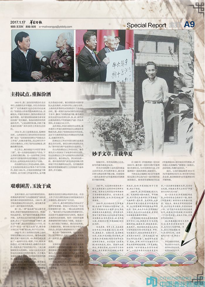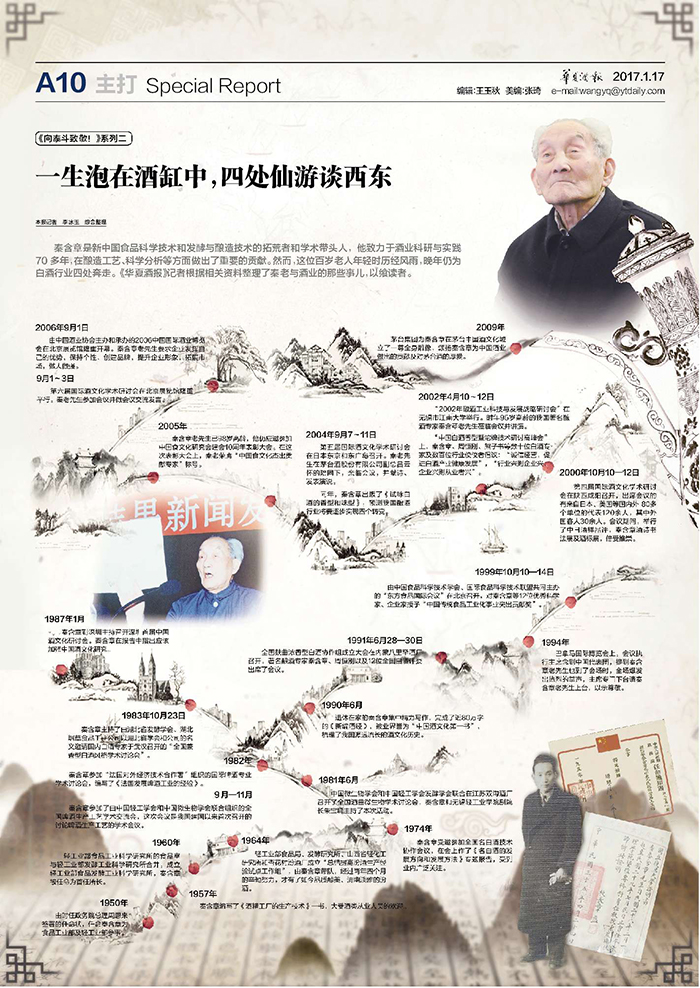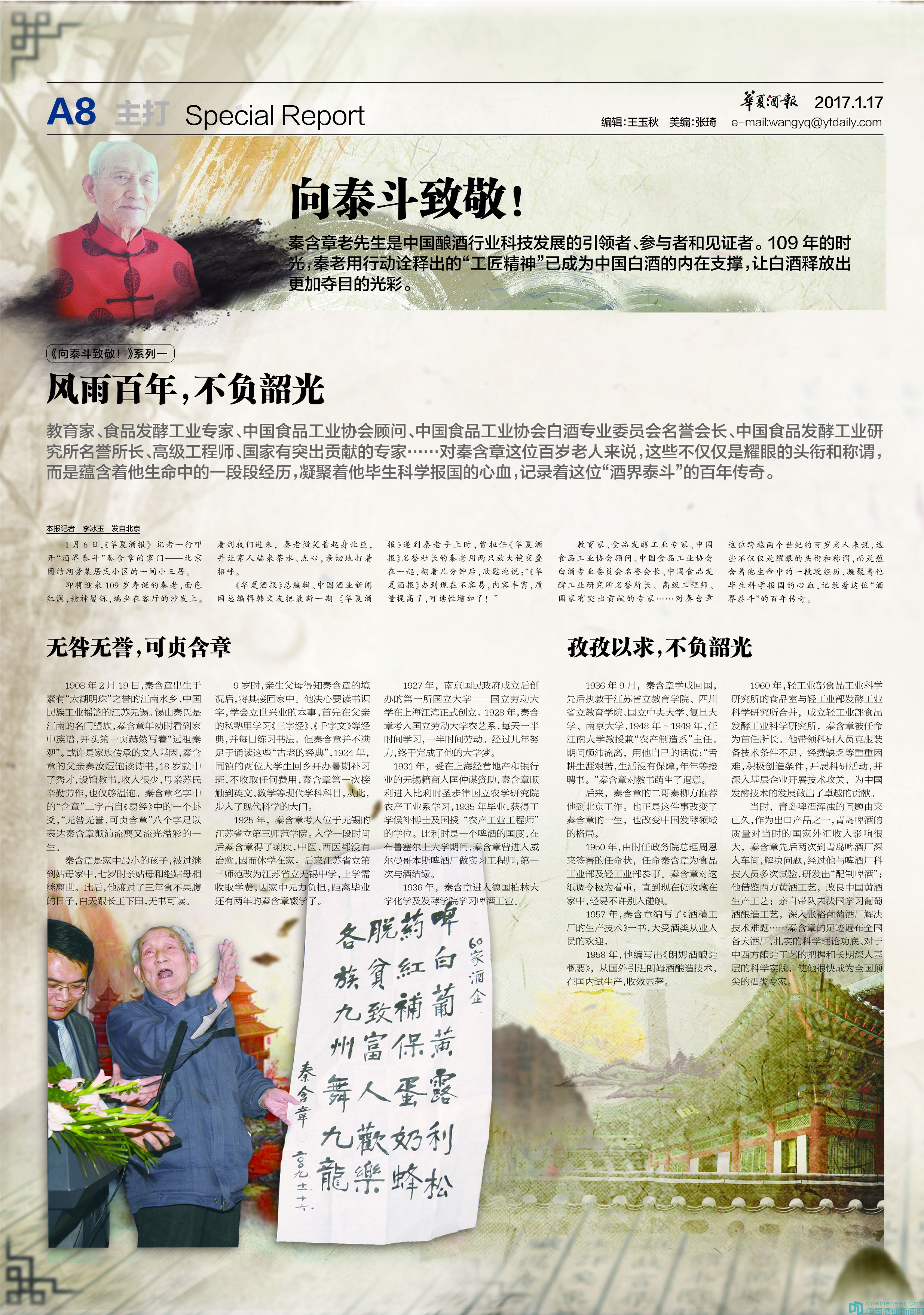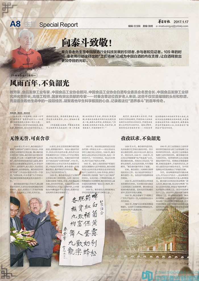 秦含章是新中國食品科學技術和發酵與釀造技術的拓荒者和學術帶頭人,他致力于酒業科研與實踐70多年,在釀造工藝、科學分析等方面做出了重要的貢獻。然而,這位百歲老人年輕時歷經風雨,晚年仍為白酒行業四處奔走。《華夏酒報》記者根據相關資料整理了秦老與酒業的那些事兒,以饗讀者。 (溫馨提示:點擊圖片即可查看版面高清大圖)
