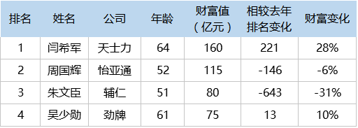 2016年,中國酒水行業(yè)比今年多兩人上榜,分別是百潤集團(tuán)董事長劉曉東(741名,169億元),郎酒集團(tuán)董事長汪俊林(1964名,65億元)。