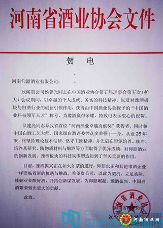 河南酒協(xié)在《賀電》中說,欣聞在中國酒業(yè)協(xié)會第五屆理事會第五次(擴(kuò)大)會議上,貴司侯建光同志以卓越的科學(xué)技術(shù)水平、淡泊名利的工匠精神,榮獲了中國酒業(yè)協(xié)會授予的“中國酒業(yè)科技領(lǐng)軍人才”稱號,為豫酒贏得了榮譽(yù),特向仰韶酒業(yè)及侯建光同志致以衷心的祝賀!