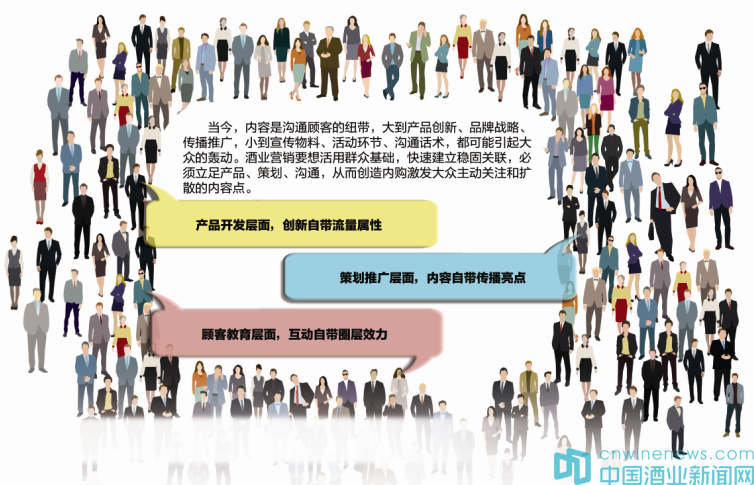 當今,內容是溝通顧客的紐帶,大到產品創新、品牌戰略、傳播推廣,小到宣傳物料、活動環節、溝通話術,都可能引起大眾的轟動。酒業營銷要想活用群眾基礎,快速建立穩固關聯,必須立足產品、策劃、溝通,從而創造內購激發大眾主動關注和擴散的內容點。