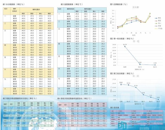通過表1水分數(shù)據(jù)表、表2各輪次各層面最終水分變化,發(fā)現(xiàn)堆積堆心、底部水分相對較高,而面層、表層水分含量稍低。