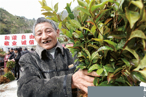 春耕來臨之際,安徽歙縣許村鎮箬嶺村黨總支積極開展精準扶貧幫貧困戶工作,爭取到了省農科院茶葉研究所和黃山茶產業技術研究院全力支持。黨總支書記蔣承君說,3月3日已經免費給95戶貧困農民發放36000株新品種白茶苗,當日進行了現場培訓栽種技術。圖為蔣承君(右前)在給貧困戶免費發“蜈蚣嶺白茶”苗。