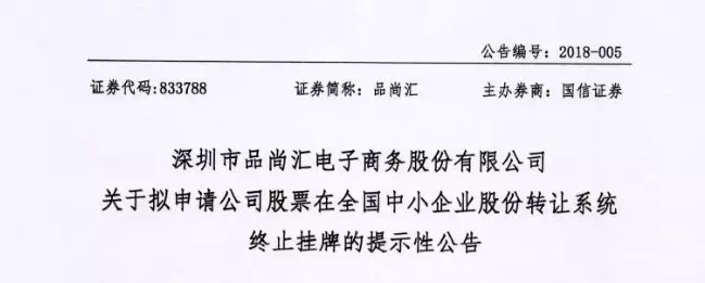 2018年1月9日,深證市品尚匯電子商務(wù)股份有限公司(以下簡(jiǎn)稱“品尚匯”)發(fā)布了《關(guān)于擬申請(qǐng)公司股票在全國中小企業(yè)股份轉(zhuǎn)讓系統(tǒng)終止掛牌的提示性公告》以及《關(guān)于擬申請(qǐng)公司股票在全國中小企業(yè)股份轉(zhuǎn)讓系統(tǒng)終止掛牌的投資者保護(hù)措施的公告》。