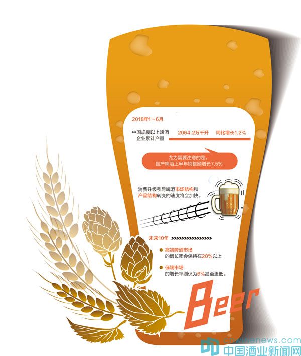 近期,隨著2018年上半年經濟報告的出爐,沿著從高速度發展向高質量發展轉變的路子,酒業的結構得以調整,科技推動的作用得以強化,創新的引領作用越來越強。進入2018年以來,國產啤酒逐漸扭轉了下滑的態勢,實現了小幅穩步增長。根據國家統計局數據顯示,2018年1~6月,中國規模以上啤酒企業累計產量2064.2萬千升,同比增長1.2%。尤為需要注意的是,國產啤酒上半年銷售額增長7.5%。