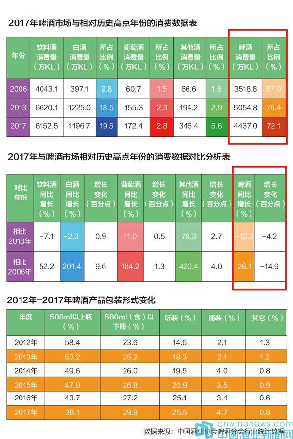 中國酒業協會啤酒分會的統計數據顯示,2006年,飲料酒消費量為4043.1萬千升,其中白酒銷費量397.1萬千升,占比9.8%;葡萄酒消費量60.7萬千升,占比1.5%;啤酒消費量3518.8萬千升,占比87%。2013年,飲料酒消費量為6620.1萬千升,其中白酒銷費量1225萬千升,占比18.5%;葡萄酒消費量155.3萬千升,占比2.3%;啤酒消費量5054.8萬千升,占比76.4%。2017年,飲料酒消費量為6152.5萬千升,其中白酒銷費量1196.7萬千升,占比19.5%;葡萄酒消費量172.4萬千升,占比2.8%;啤酒消費量4437萬千升,占比72.1%。