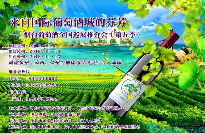 2018年11月7日—13日,由煙臺(tái)市葡萄與葡萄酒局、煙臺(tái)市葡萄與葡萄酒協(xié)會(huì)主辦,華夏酒報(bào)、中國酒業(yè)新聞網(wǎng)承辦,蓬萊市葡萄與葡萄酒局、愛酒人俱樂部協(xié)辦的“來自國際葡萄酒城的芬芳”——煙臺(tái)葡萄酒全國巡展推介會(huì)(第五季),將再次以產(chǎn)區(qū)的名義出發(fā),走進(jìn)福建泉州、漳州和江西贛州。