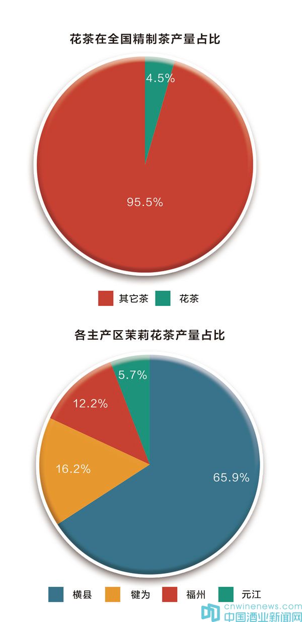 據推算:2017年,全國精制茶總產量約221.8萬噸,總產值1907.6億元;茉莉花茶生產總量約為9.9萬噸,總產值106.6億元,占比分別為4.5%、5.6%。