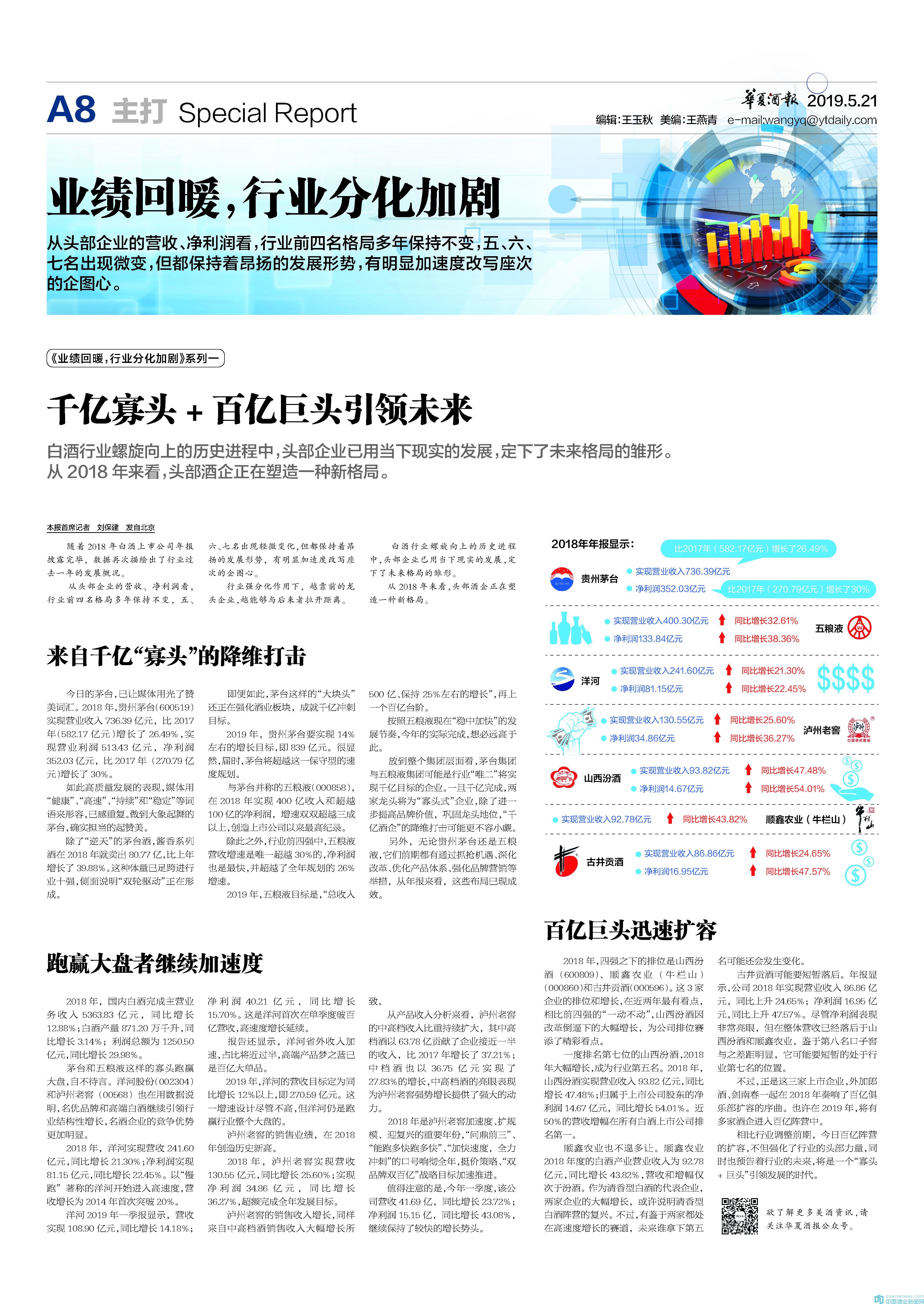2019年5月21日,《華夏酒報》刊發(fā)了《業(yè)績回暖,行業(yè)分化加劇》系列報道。