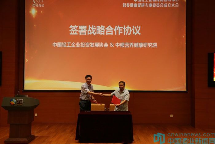 中國(guó)輕工企業(yè)投資發(fā)展協(xié)會(huì)理事長(zhǎng)李國(guó)都先生和中糧營(yíng)養(yǎng)健康研究院院長(zhǎng)助理科技與市場(chǎng)開發(fā)部總經(jīng)理鐘鳴先生共同簽署戰(zhàn)略合作協(xié)議,雙方單位共同推進(jìn)營(yíng)養(yǎng)健康產(chǎn)業(yè)工作。