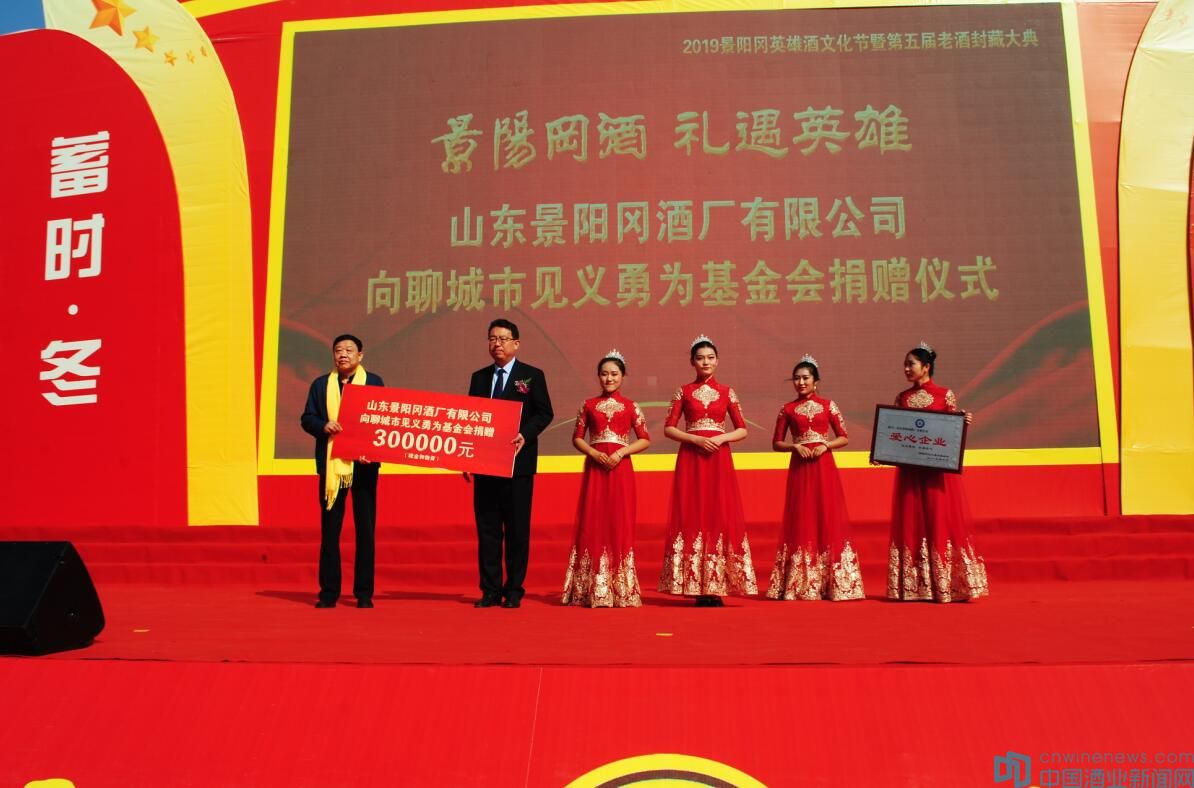 景陽岡酒作為中國獨樹一幟的英雄酒,大力弘揚社會正氣,倡導并激勵見義勇為是景陽岡人義不容辭的責任和使命。在封藏大典現場,山東景陽岡酒廠有限公司董事長趙傳新代表公司,向聊城市見義勇為基金會捐贈30萬元,用于對聊城市見義勇為人員的表彰、獎勵、慰問、撫恤、資助及對見義勇為人員家庭的關愛和幫扶。