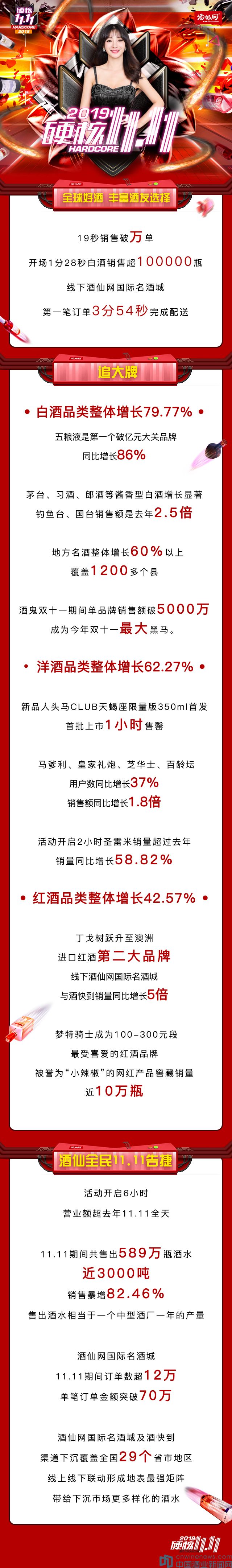 戰報顯示:酒仙網硬核雙十一活動開始19秒銷售破萬單,開場1分28秒白酒銷售超10萬瓶,活動開啟6小時,營業額便超去年11.11全天,線下酒仙網國際名酒城第一筆訂單3分54秒完成配送。