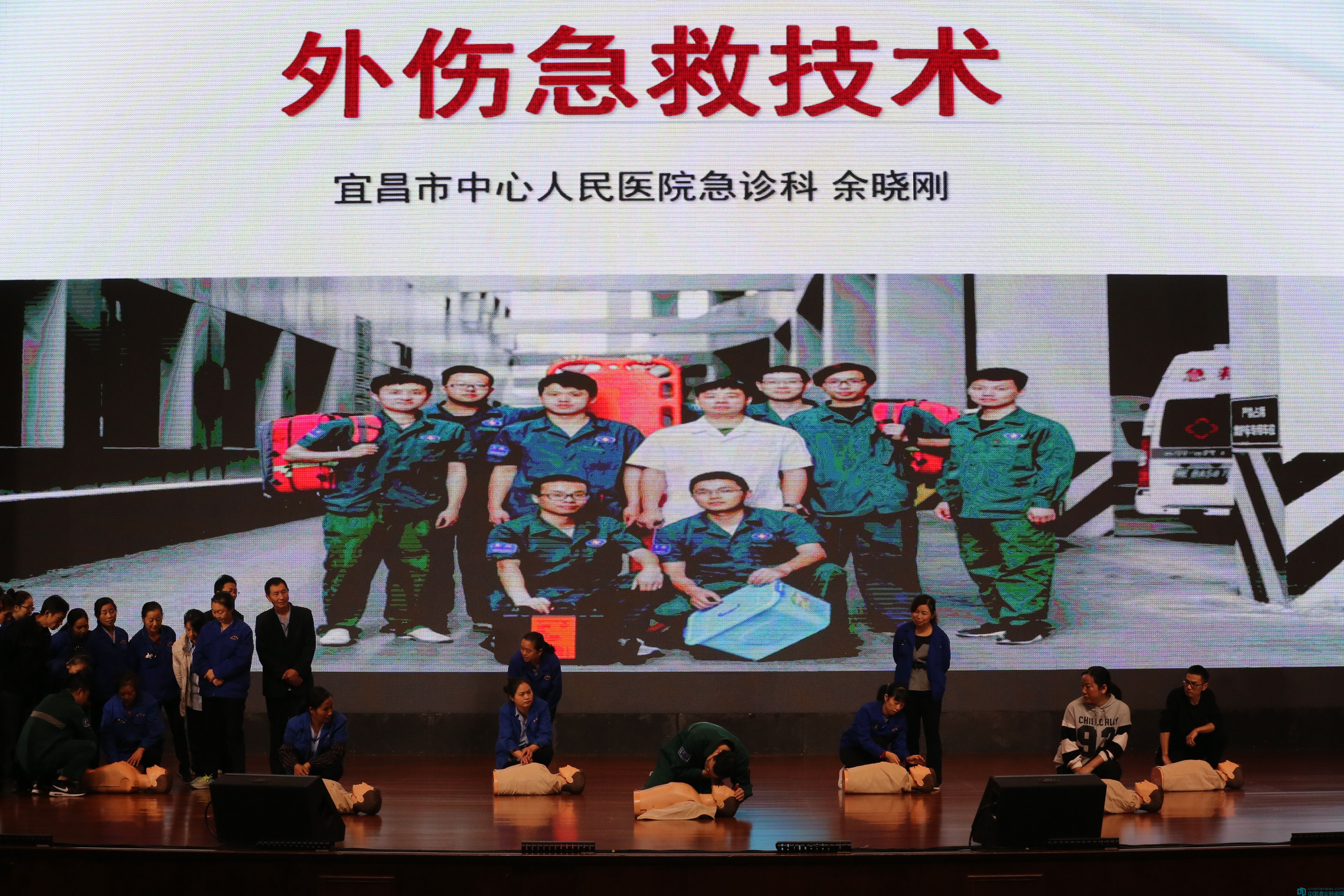 外傷出血怎么止血、骨折后如何臨時固定……宜昌市中心人民醫(yī)院急診科的醫(yī)護人員郭慶、余曉剛等現(xiàn)場邀請員工上臺進行外傷止血按壓、傷口包扎、胸外按壓等模擬演練,在在醫(yī)護人員的專業(yè)指導(dǎo)下,員工結(jié)合所學(xué)知識對人體模型進行訓(xùn)練。大家紛紛表示此次講座加深了對日常生活中的危害疾病和意外傷害的認識,干貨滿滿、受益匪淺。