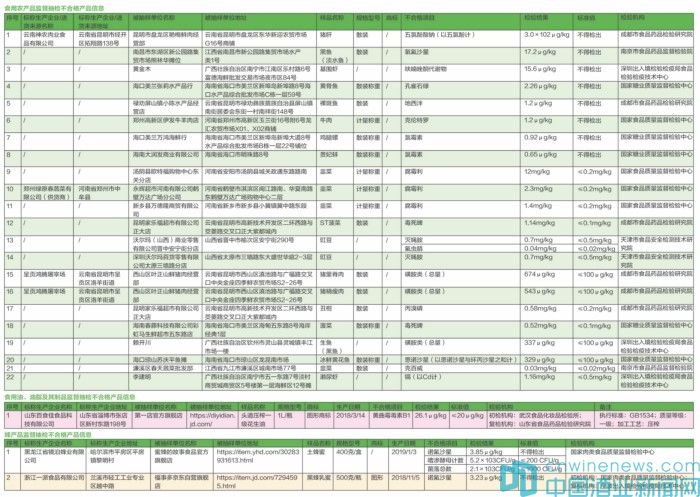 從抽檢的總體情況來看,其中抽檢的食用油、油脂及其制品不合格樣品1批次,檢出不合格的檢測項目為黃曲霉毒素B1;抽檢的蜂產品不合格樣品2批次,檢出不合格的檢測項目為諾氟沙星、菌落總數、嗜滲酵母計數;抽檢食用農產品不合格樣品22批次,檢出不合格的檢測項目為五氯酚酸鈉(以五氯酚計)、氧氟沙星、呋喃唑酮代謝物、孔雀石綠、地西泮、克倫特羅、氯霉素、腐霉利、毒死蜱、滅蠅胺、氟蟲腈、磺胺類(總量)、丙溴磷、恩諾沙星(以恩諾沙星與環丙沙星之和計)、克百威、鎘(以Cd計)。