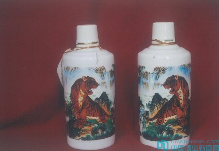 這酒是安徽中皖酒業有限公司出品的,是“擷林齋開業一周年紀念”酒,酒名是“十年家酒”。酒瓶是圓柱型,整體高19厘米,身周長25厘米,正面的一大幅畫面占19厘米。虎仿佛是在野外,看其身周圍,有山有水,有草有樹,自然環境優美。兩虎協調得很好,左邊的虎轉身向右看,右邊的虎轉身向左看,兩虎動作一樣。虎頭圓大,前額有似“王”字形斑紋,嘴大張著,全身黃毛,間有黑條紋,尾向上翹起,仿佛很興奮,很有氣勢。