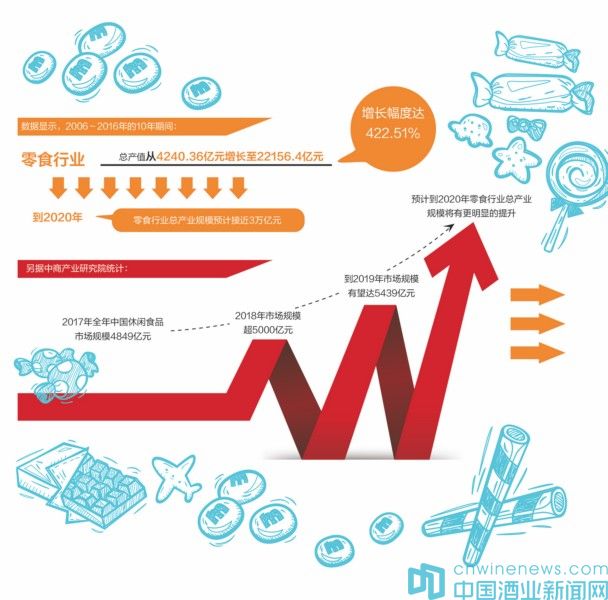 2018年12月,商務(wù)部流通產(chǎn)業(yè)促進(jìn)中心發(fā)布《2018消費(fèi)升級(jí)背景下零食行業(yè)發(fā)展報(bào)告》稱(chēng),零食行業(yè)發(fā)展步入快車(chē)道,呈現(xiàn)“快、廣、多、變”的特點(diǎn),成為未來(lái)快速消費(fèi)品市場(chǎng)中最具前景、最具活力的行業(yè)。中國(guó)休閑食品銷(xiāo)售量的不斷增長(zhǎng),也推動(dòng)了休閑食品的市場(chǎng)規(guī)模快速擴(kuò)大。數(shù)據(jù)顯示,2006~2016年的10年期間,零食行業(yè)總產(chǎn)值從4240.36億元增長(zhǎng)至22156.4億元,增長(zhǎng)幅度達(dá)422.51%,到2020年,零食行業(yè)總產(chǎn)業(yè)規(guī)模預(yù)計(jì)接近3萬(wàn)億元。另?yè)?jù)中商產(chǎn)業(yè)研究院統(tǒng)計(jì),2017年全年中國(guó)休閑食品市場(chǎng)規(guī)模4849億元,2018年市場(chǎng)規(guī)模超5000億元,到2019年市場(chǎng)規(guī)模有望達(dá)到5439億元,預(yù)計(jì)到2020年零食行業(yè)總產(chǎn)業(yè)規(guī)模將有更明顯的提升。中國(guó)零食行業(yè)近年來(lái)正以驚人的速度步入產(chǎn)業(yè)快車(chē)道,進(jìn)入4.0時(shí)代。