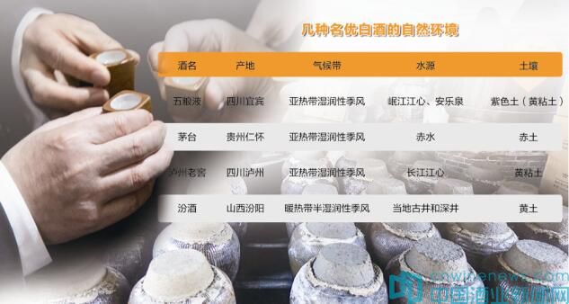 唐亞等對全國5000多家酒廠的地理分布的分析發現,白酒企業具有明顯的地域聚集性,而以四川宜賓、瀘州和貴州仁懷在我國白酒生產上最為重要。全國酒廠的地理分布特征及在全國白酒行業中的地位揭示了自然條件在白酒釀造上的重要性。白酒的釀造實踐證明,自然條件是一個地區能否釀造好酒的決定性因素——即“天時、地利”。