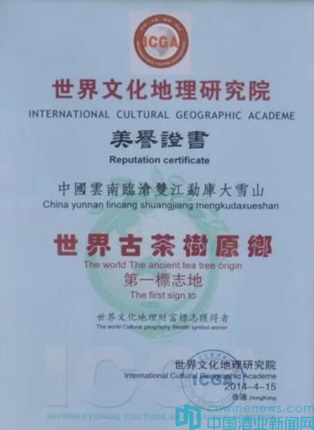 (圖:世界文化地理研究院頒發(fā)的“世界古茶山原鄉(xiāng)第一標(biāo)志地”證)